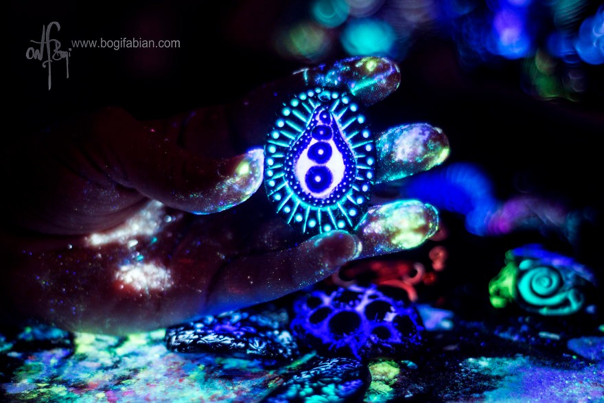 Fabian works with a vast array of custom-developed materials, many of which are sourced from specialized chemical laboratories. Her use of glow-in-the-dark pigments, fluorescent inks, UV-reactive paints, and phosphorescent minerals allows her to manipulate how surfaces absorb and emit light. These substances are not commercially standard; in many cases, Fabian must modify or combine compounds to achieve the unique glow, longevity, and color gradient she envisions. This makes each project an exercise in material alchemy—a term she often uses to describe her artistic process.