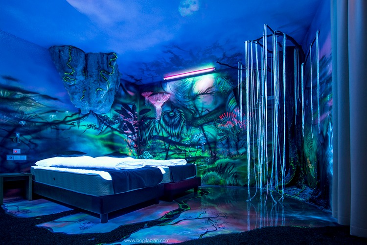 From adolescence onward, she became increasingly interested in luminescent materials, especially phosphorescent pigments that react to black light and darkness. This obsession eventually laid the foundation for her signature style: site-specific installations and glowing murals that transform in different lighting conditions. These artworks are not static; they evolve throughout the day, offering entirely distinct visual experiences in daylight, twilight, and total darkness. Such transformative art had rarely been seen before in contemporary Europe, and Fabian stood at the forefront of this emerging niche.