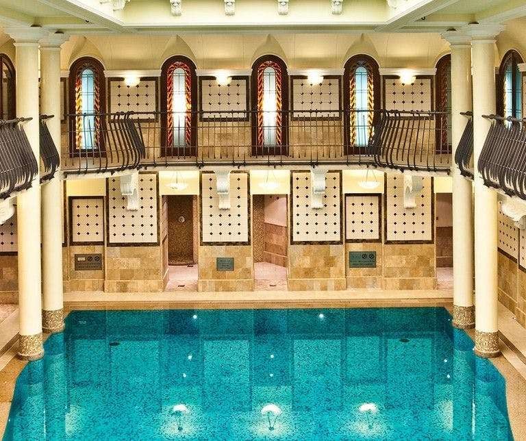 One of the defining features of Corinthia Hotel is its grand Royal Spa, a restored space inspired by 19th-century noble bathing halls. The domed atrium conceals a deep pool, Jacuzzi, steam room, and Finnish sauna, all beneath stained glass skylights and mosaic tile flooring. The spa draws on Budapest’s famed thermal tradition, offering treatments with local spa brands, aromatic oils, and signature mud wraps that echo the restorative ethos of Hungarian bathing culture. Guests may glide beneath painted domes or ascend the marble staircase to relax in a lounge area overlooking grand columns. Technically advanced fitness facilities and yoga studios complement the wellness offerings. Signature experiences such as champagne floats or hot stone massages provide ritualized relaxation rooted in heritage, lending an immersive spa narrative. Whether beginning the day with a swim beneath golden stained-glass panels or winding down with a thermal treatment after city touring, the spa communicates a sense of urban sanctuary that connects the past to soothing modern wellness. It is both a destination within the hotel and a cultural bridge to Budapest’s spa legacy.