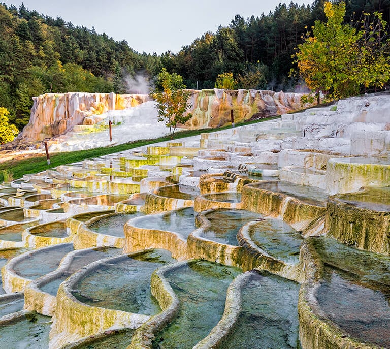 A natural masterpiece where mineral springs carve dramatic white terraces, blending wellness and wonder in the Hungarian countryside