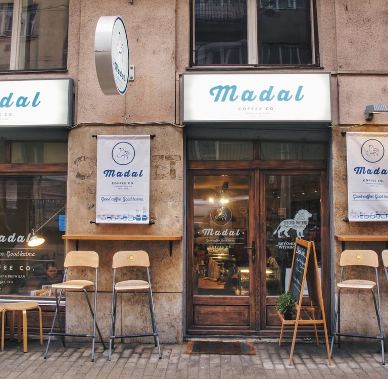 Madal Café has multiple locations in Budapest, including on Ferenciek Square, Baross utca, Arany János utca, and the Szeged airport station. Most cafés open between 8:00 AM and 8:00 PM, Monday through Saturday, with reduced hours on Sundays. Prices range from approximately 500 to 1,000 HUF for espresso-based drinks and 700–1,200 HUF for single-origin filter brews. Bean packages (200g) cost between 2,400 and 3,400 HUF, depending on origin. The cafés take card and cash payments, offer free Wi-Fi, and allow takeaway orders. They provide equipment rental or retail for home brewing gear. Wheelchair access is available at certain locations, though not all entrances accommodate strollers easily. Each café location offers limited seating—intended for focused coffee consumption rather than extended dining. The cafés are busiest mid-morning and late afternoon; early morning and early evening are quieter. No outside food is accepted. Public transit connections (metro line 3, trams, buses) serve all central outlets. They do not serve full meals but offer pastries, croissants, and light snacks. They encourage lingering but request that peak customers vacate their seats after one to two cups. The cafés are pet-friendly, with water bowls available.