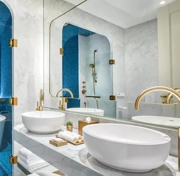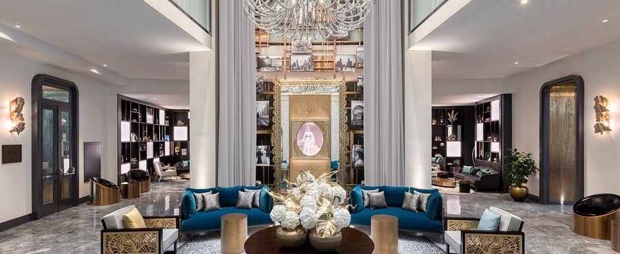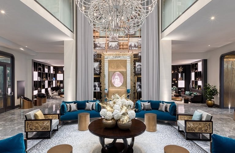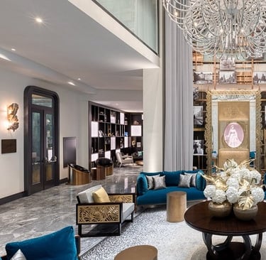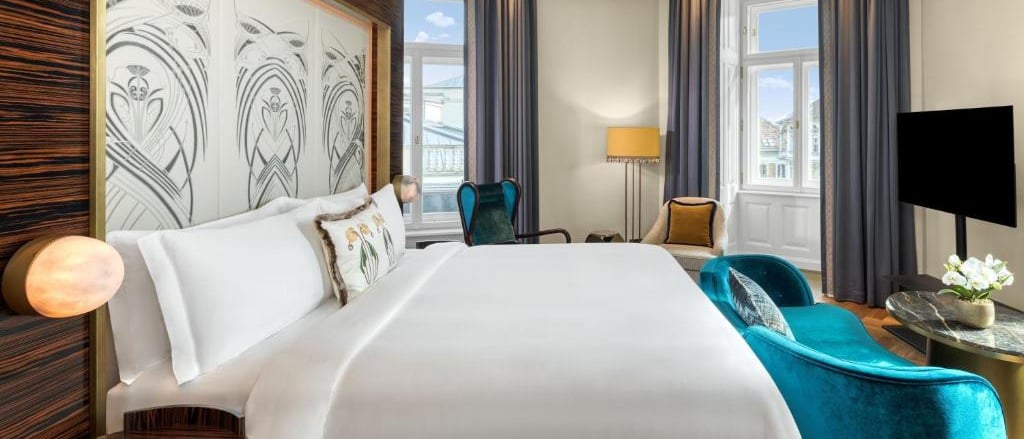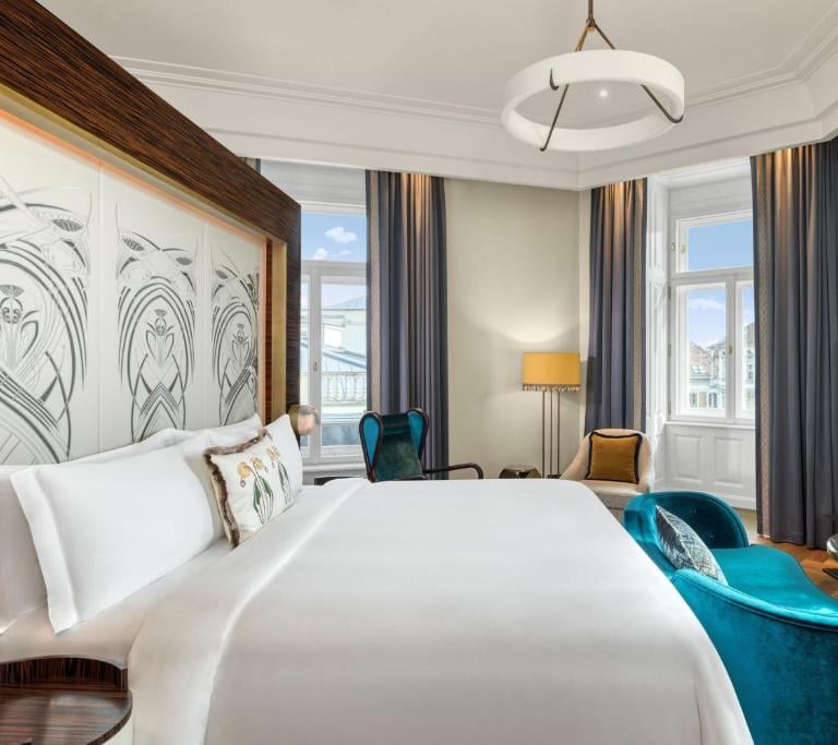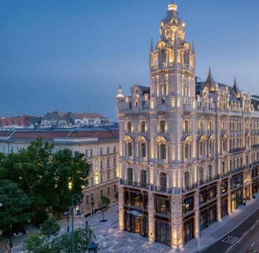 Matild Palace stands as a stunning testament to Budapest’s turn-of-the‑20th‑century opulence, originally commissioned in 1902 by Archduchess Maria Klotild of Saxe‑Coburg and Gotha as one of two mirrored palaces framing the Elisabeth Bridge. For over a century, it served as a cultural nexus, then endured wars, neglect, and political upheaval. After a five‑year restoration completed in 2021 under the vision of MKV Design, the palace was reborn as a Luxury Collection hotel, painstakingly preserving its UNESCO World Heritage architecture, wrought‑iron detailing, stained‑glass windows, hand‑carved stone, fishbone parquet flooring, and the first elevator ever installed in Hungary. Today, the exterior façade sparkles in carefully selected teal, gold, and copper paint layers, reviving the original Baroque and Art Nouveau opulence. Inside, the building’s history doesn’t just inform aesthetics—it becomes part of the guest journey. From entry beneath carved arches to corridors lined with frescoed murals and mosaic tiling, the space reads like an architectural biography. Historic elegance, urban renewal, literary resonance, Germanic legacy, and European grandeur merge into one cohesive guest experience that honors tradition while embracing luxury.
