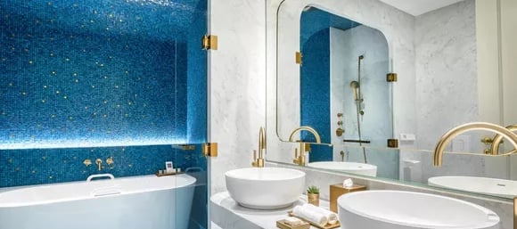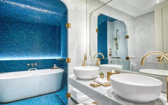 Step into a guestroom and you enter a space that combines palace‑like scale with modern refinement. The hotel offers 111 rooms and 19 suites, including standout accommodations such as the Crown Tower Suite—a three‑floor private tower retreat with 360-degree views—and the Maria Klotild Royal Suite, featuring handmade mosaics, marble baths, hand‑embroidered textiles, and panoramic Danube vistas. Rooms are furnished in soothing jewel tones inspired by Budapest’s rooftops, with fishbone parquet floors, Hungarian‑crafted headboards, plush custom bedding, digital climate control, Nespresso machines, and baths featuring sprayed rain showers or cast bathtubs. Many rooms face the Danube or Elisabeth Bridge, delivering cinematic river views at sunrise. Contemporary technology such as Bose sound systems and seamless Wi‑Fi sits alongside period moldings, marble bathrooms, heritage flourishes, tower silhouettes, and a fusion of old‑world elegance and modern convenience. The effect is immediate: you sense you are in a palace, but one built for today’s traveler who wants comfort as much as character.