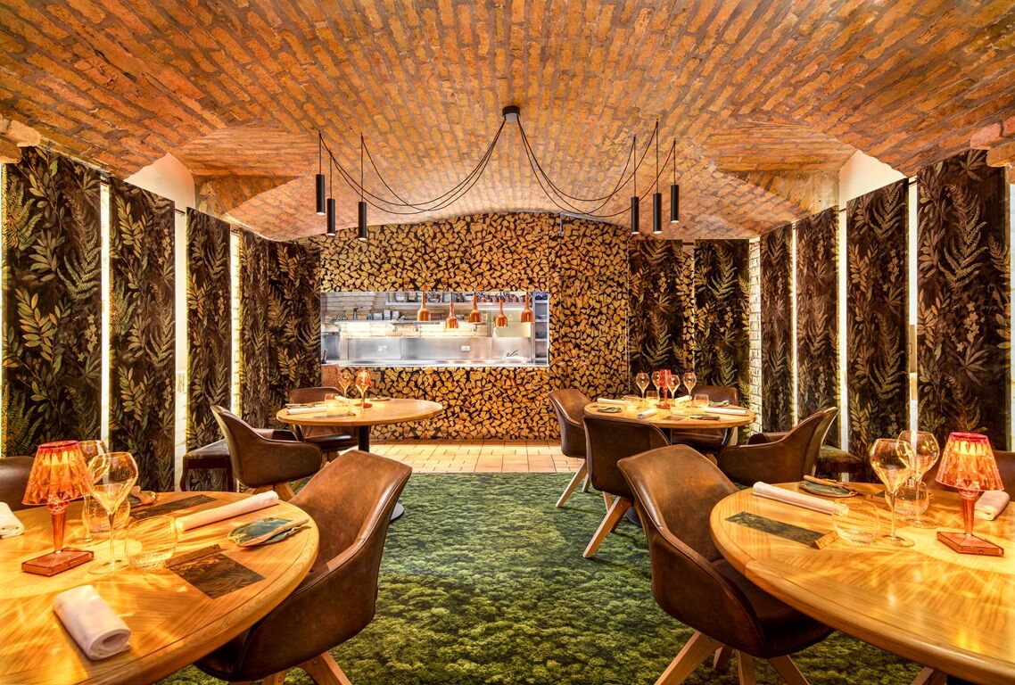 Situated beneath the historic castle, within Platán Manor, the décor is elegant yet unobtrusive. Barrel-vaulted ceilings of the cellar, exposed stone, and polished wood surfaces create a timeless atmosphere that feels both grand and home‑grown. Soft lighting and tasteful furnishings extend the sense of refined comfort. The transitions between spaces—lakeside welcome room to vaulted cellar salon—enhance the narrative rhythm of the evening. Each environment frames the food, reinforcing the connection between history, nature, and fine dining artistry without luxury overwhelming simplicity.