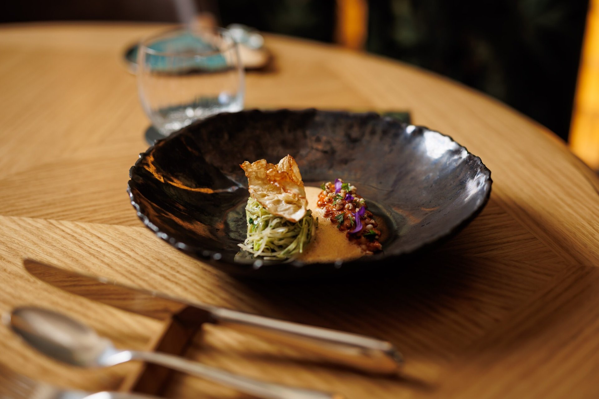 Guests typically begin their evening with welcome bites and an aperitif in a bright room overlooking the lake, offering a prelude to the 12‑course tasting menu. These snacks—perhaps black pudding, octopus, or gin-and-tonic variations—serve as both a nod to tradition and a signal of international creativity with regional roots. From there diners are led into one of two refined salons: the Green Salon, where the open pass kitchen reveals the orchestration of cooking, or the Blue Salon, offering a more intimate, cloistered experience. This progression from lake-view lightness to cellar‑vault intimacy creates a journey of ambiance that mirrors the menu’s evolving sophistication.