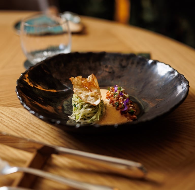 The heart of the experience lies in a 12‑course tasting menu that changes seasonally but always surprises. Dishes marry Hungarian, French, and Asian influences, with each plate showing meticulous technique and compositional balance. Chef Pesti blends French culinary foundations with local ingredients grown in the restaurant’s own garden, using fermentation, house-made juices, and preserved elements to extend flavor across seasons. Whether it’s a fish chowder echoing national identity or delicately spiced game indicating global reach, every offering speaks of creative coherence and quiet precision. Plates are visually composed yet understated—clean lines, harmonious textures, and aromatic accents—designed to allow the flavors to shine without distraction.