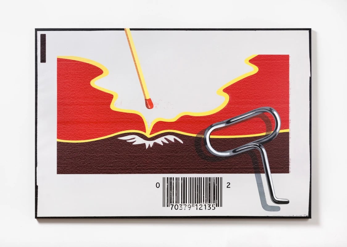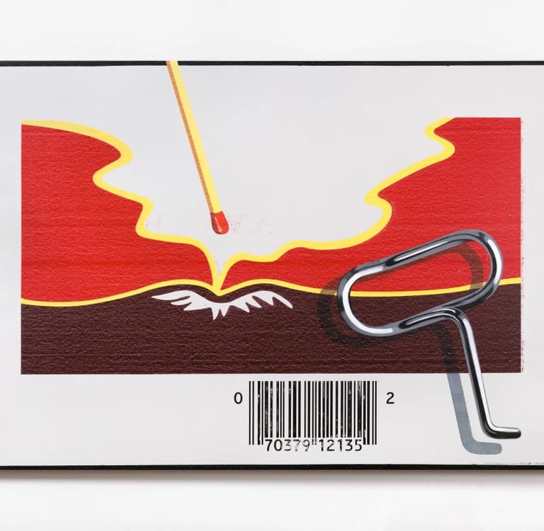 Batykó’s paintings carry existential complexity wrapped in visual references to everyday consumption and digital culture. He transforms vector diagrams, packaging, and found prints into portraits of discarded experience—objects that evoke stories of use, displacement, and erasure. Batykó’s paintings often include anthropomorphic figures—one-eyed cyclops forms or mask-like silhouettes—suggesting fragmented identity in the digital age. The presence of consumer waste becomes political: litter becomes testimony to mass production, abandonment, and environmental disregard. Yet, the surfaces remain sensually compelling: dripping paint, powdery smears, opaque layers. Through the intersection of eye fatigue (red eye), digital screen glow, and mechanical abrasion, he creates paintings that are both critique and seduction—magnetic surfaces that reveal decay, memory, and digital shadow.