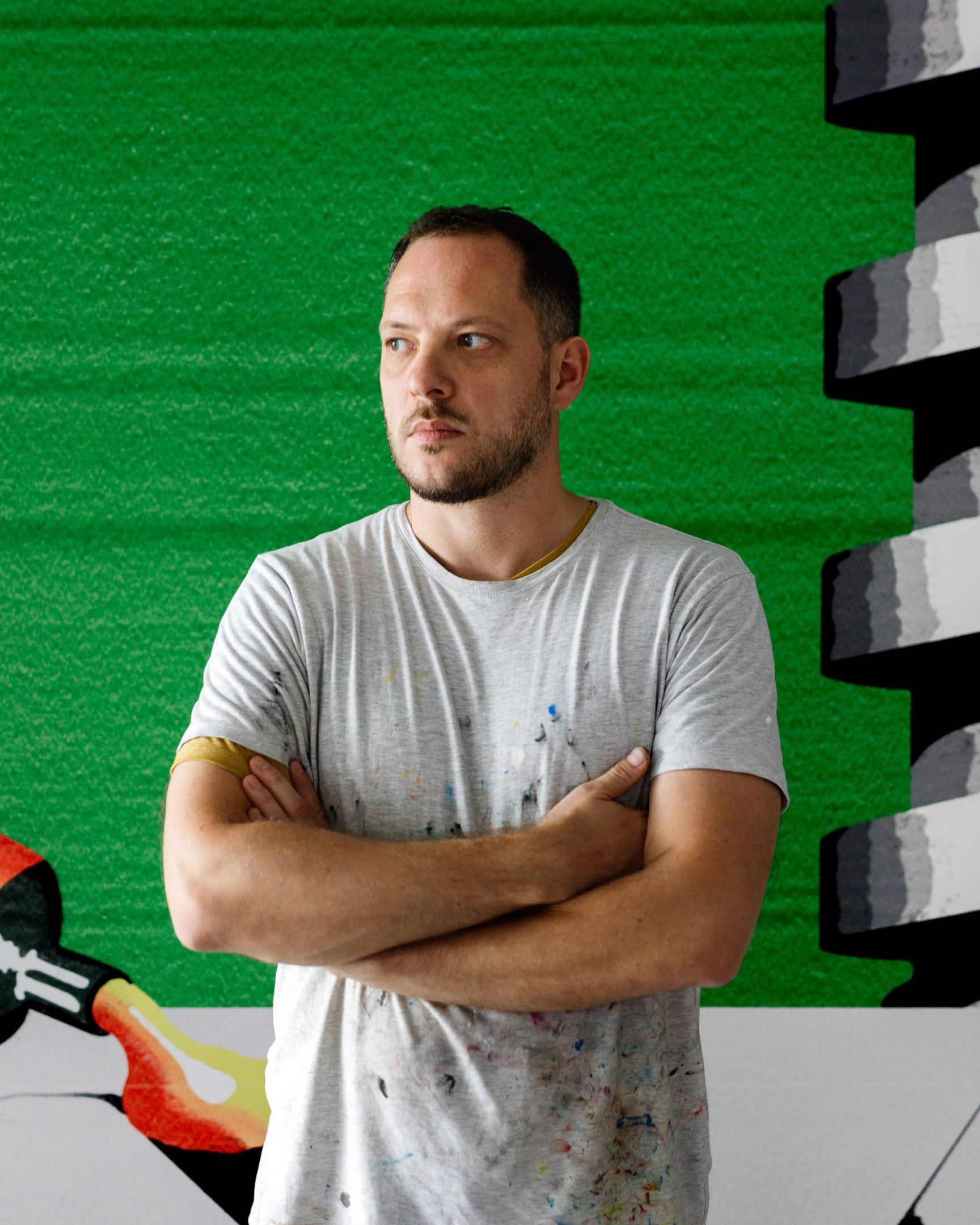 Róbert Batykó was born in 1981 in Miskolc and established himself as one of Hungary’s most distinctive artists rising from the mid‑2000s generation. He earned his Master’s in Painting from the Hungarian University of Fine Arts in Budapest under the mentorship of Károly Klimó, followed by a Doctor of Liberal Arts degree in Pécs. From the beginning, Batykó explored how digital image culture collides with traditional painting methods. His work surfaces as a conversation between analogue brushwork and the detritus of consumerism—vector illustrations, packaging, found objects—refined into monumental canvases. He developed his own scraping machine combining press and blade, enabling him to lay on paint and then remove it, in a controlled yet unpredictable gesture that leaves behind ultra-thin, layered surfaces. These processes reflect an acute awareness of image formation, memory, and technological residue—making each painting a visual autobiography of image culture and analog resistance.
