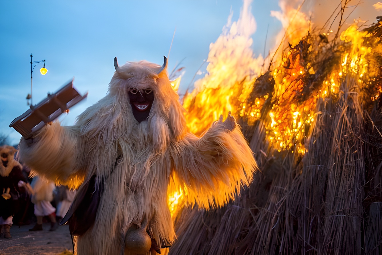 The masks themselves are carefully hand-carved from fűzfa (willow wood) and painted with fearsome expressions, often with exaggerated noses, large teeth, and fiery red eyes. These are paired with heavy cloaks made of sheep’s wool and a variety of accessories including favilla (wooden clappers), kereplő (ratchets), and in some cases, even flaming torches. One of the highlights of the event is téltemetés (winter burial), when a coffin representing winter is set aflame on the banks of the Duna (Danube), symbolically putting an end to the cold season. The főtéren (main square), crowds gather to watch the busók dance, drink pálinka (fruit brandy), eat fánk (doughnuts), and share in the mulatság (festivity) that stretches deep into the night. Children join as kisbusók (little Busós), keeping the tradition alive with innocent mischief, while women in traditional népviselet (folk costume) serve food and sing old songs. The entire town becomes a living folk theatre, with roles passed down through generations, and preparation beginning months in advance.