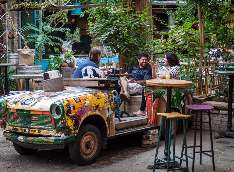 The original and still most iconic of these bars is Szimpla Kert, opened in 2002, which set the tone for what a romkocsma could be: part bar, part gallery, part community center. It was a place where you could sip fröccs (wine spritzer) in a bathtub repurposed as a sofa, watch an avant-garde film projected onto a cracked wall, or listen to a zenekar (band) playing live music in a graffiti-covered garden. Other bars like Instant, Fogasház, and Ellátó Kert followed suit, each offering its own interpretation of the genre—some leaning into elektronikus zene (electronic music), others hosting irodalmi estek (literary evenings), jógaórák (yoga classes), or even bringás boltok (bike shops). The underlying ethos of all these places is accessibility and spontaneity; no polished aesthetics or velvet ropes, just a shared love of atmosphere, music, and social connection.